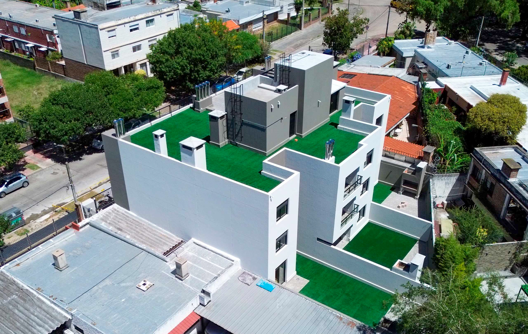 La propuesta técnica destaca por su conciencia ambiental activa. La envolvente del edificio utiliza doble vidriado hermético (DVH) para el aislamiento térmico, mientras que el interior integra sistemas de control de caudal en griferías y luminaria LED de bajo consumo en áreas comunes. La terraza del último nivel funciona como un pulmón social y una extensión natural de los 16 apartamentos, consolidando un edificio de bajo impacto ambiental y alta durabilidad estructural.